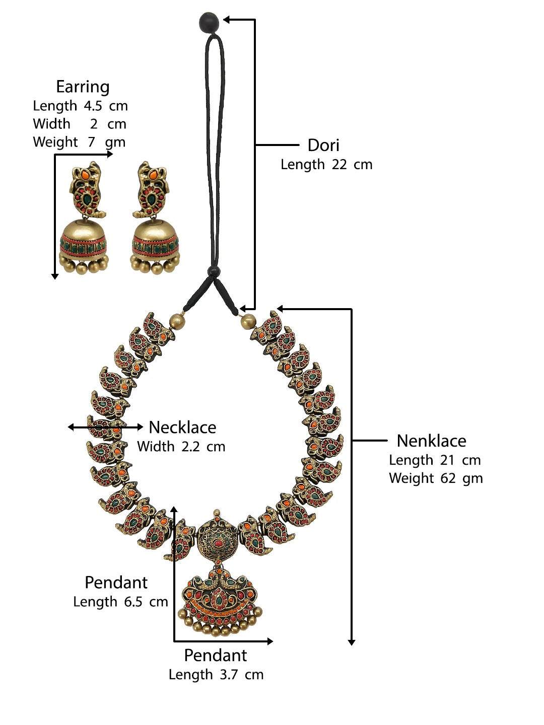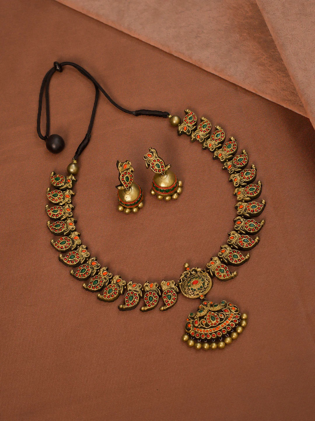Shyamamayura — Antique Gold and Black Peacock Design Handmade Terracotta Necklace Set