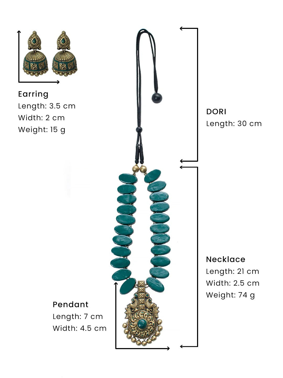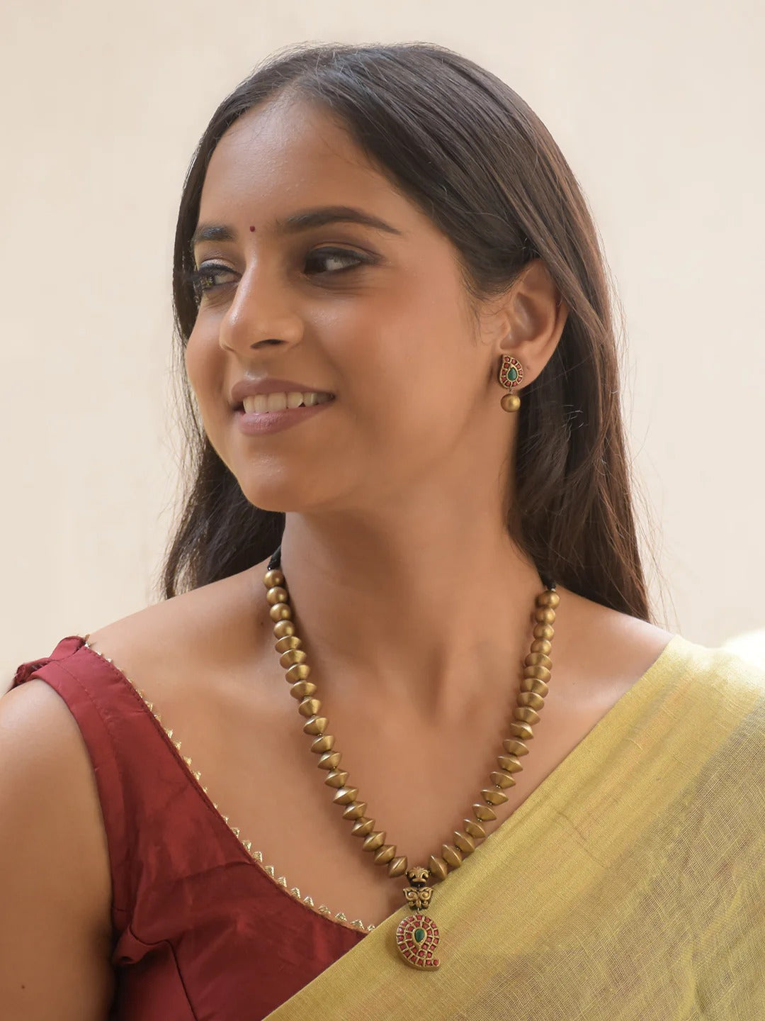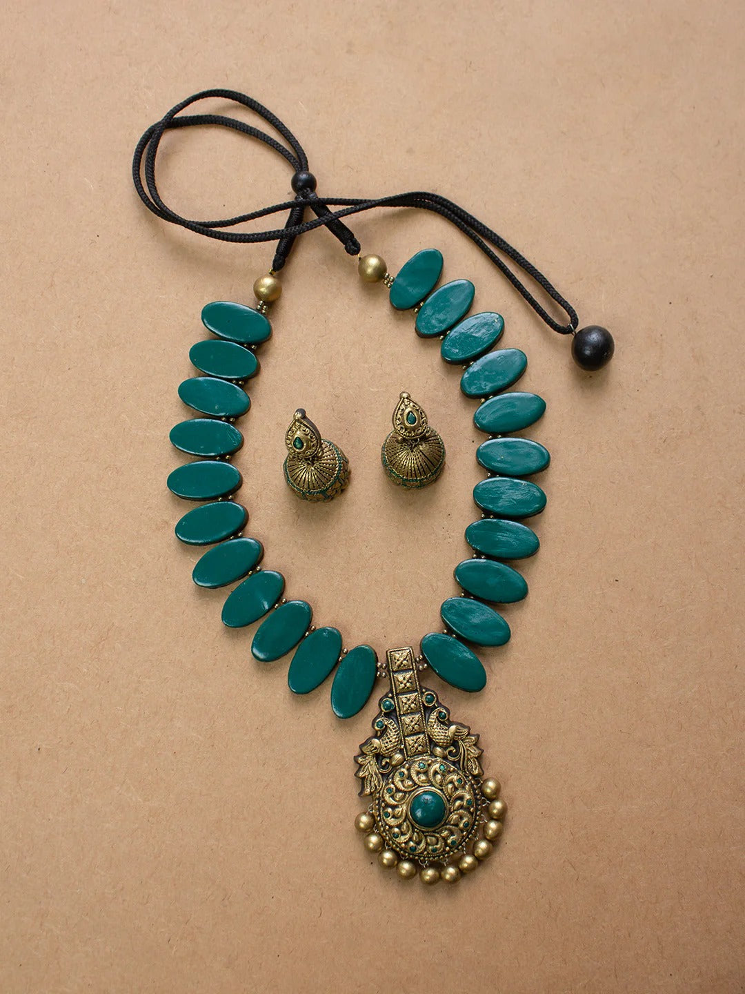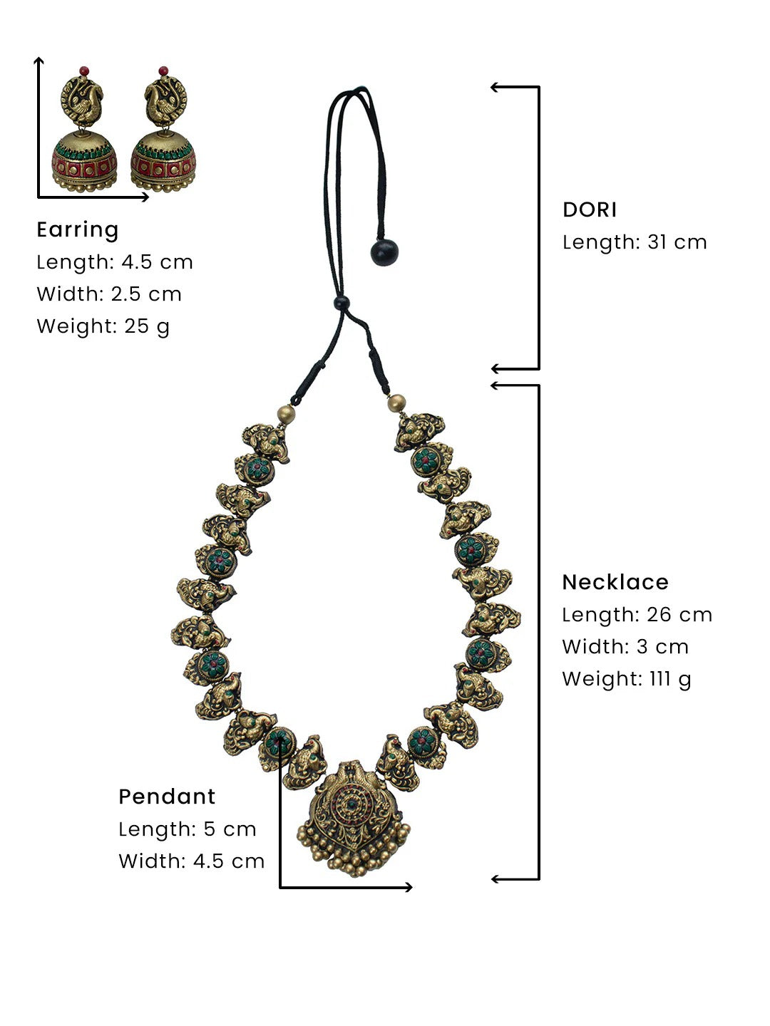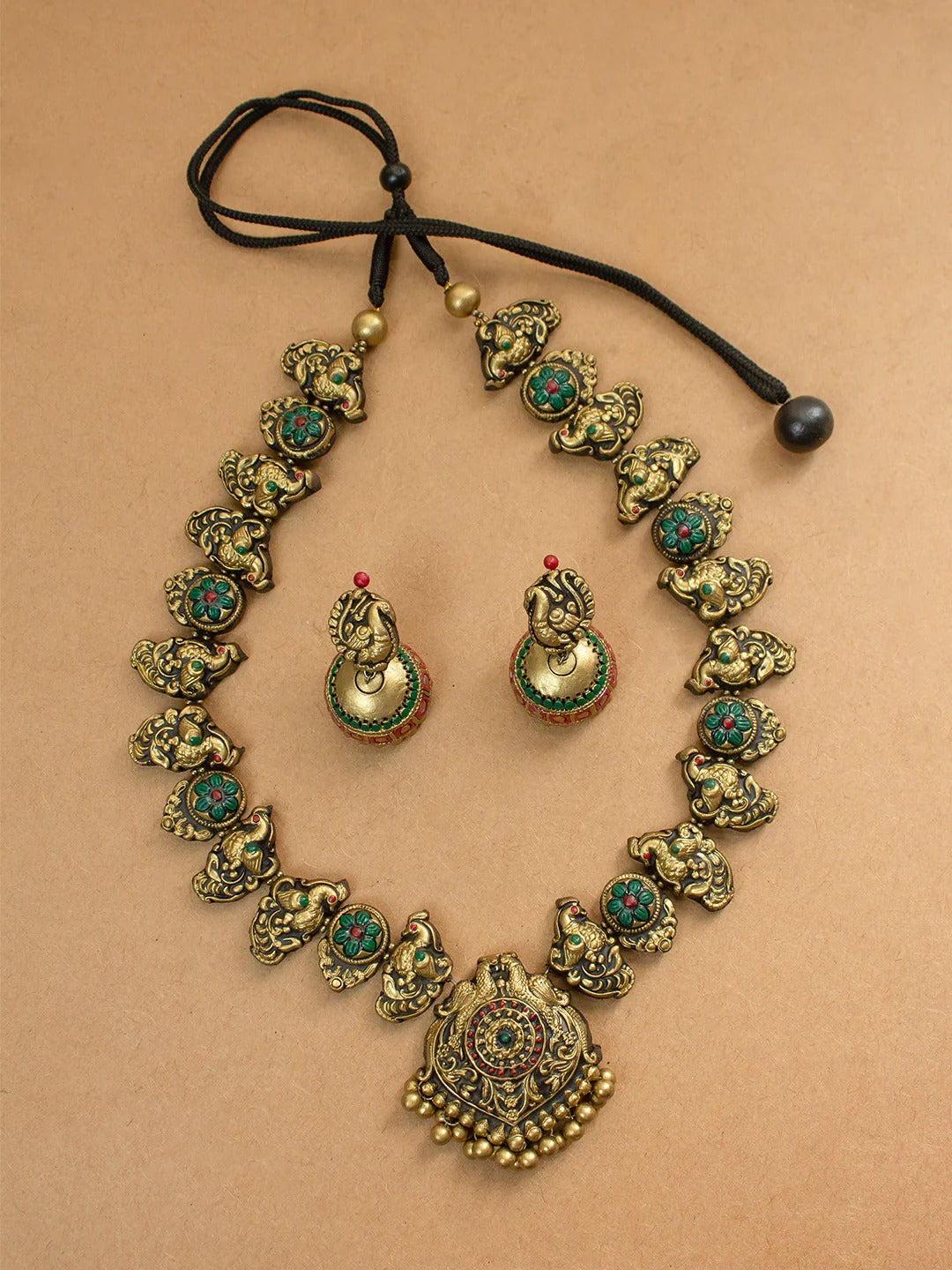 Mayuravarna — Antique Gold and Green Peacock Design Handmade Terracotta Necklace Set