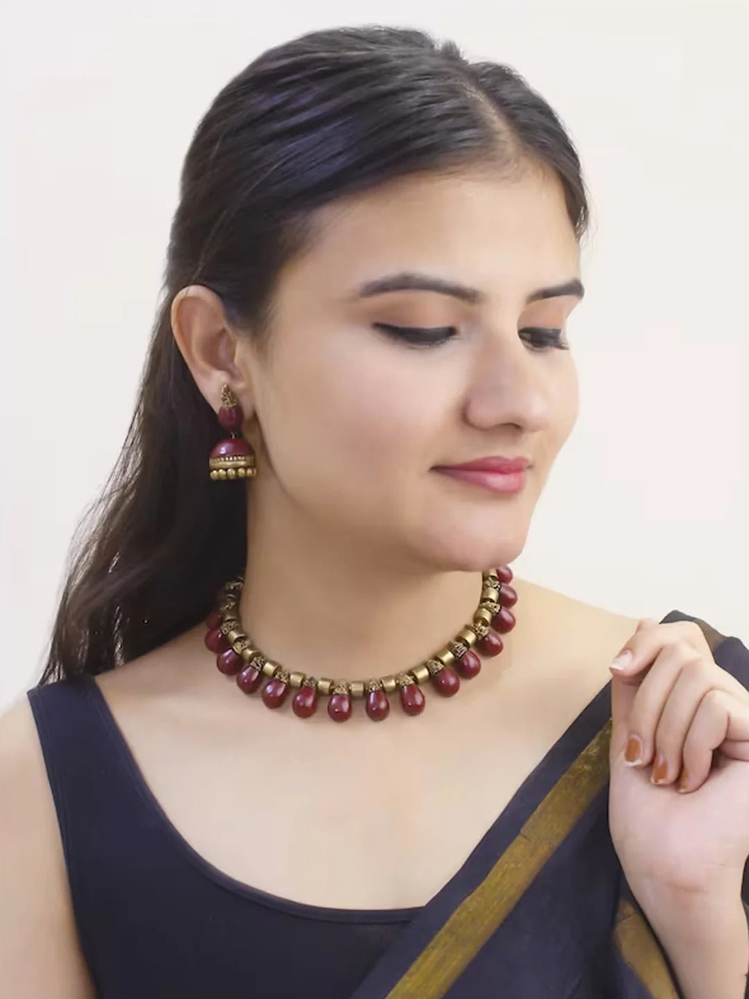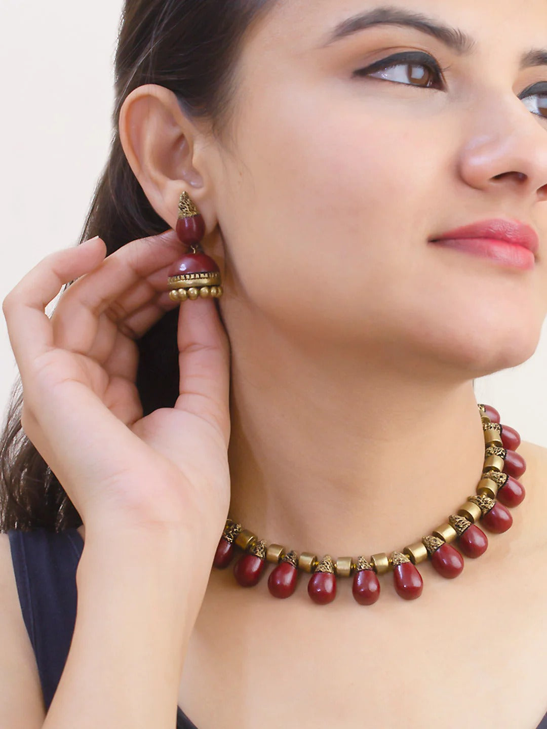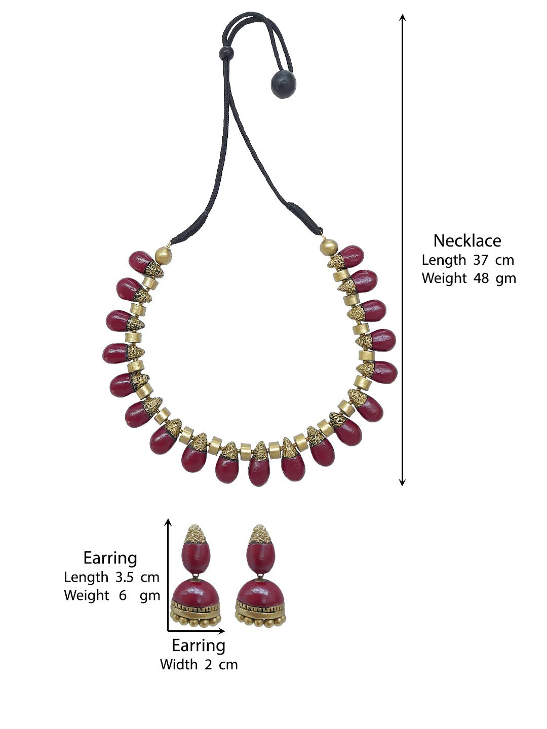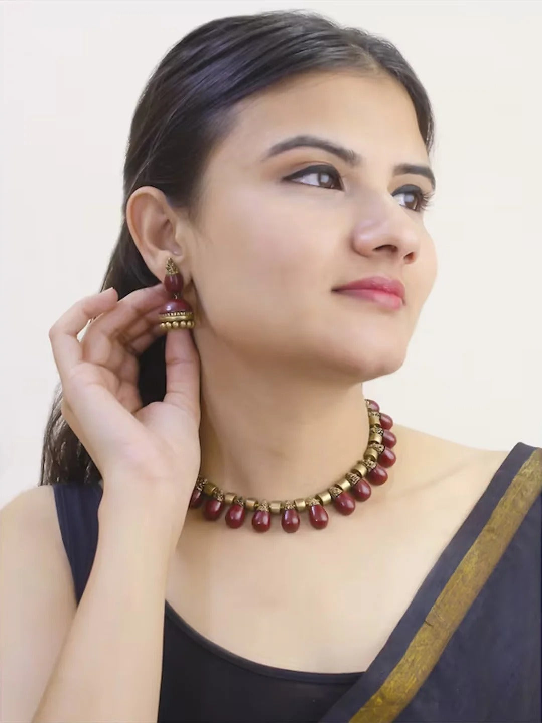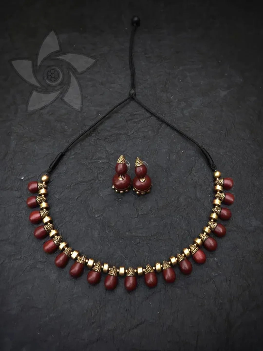 Kanmani - Tear Drop Design Handmade Terracotta Maroon Colour Choker Necklace Set