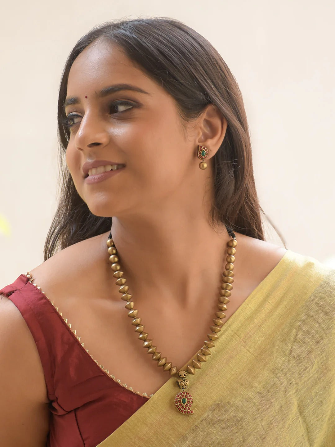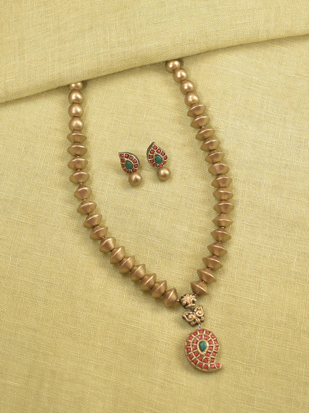 Paisleyara - Handmade Terracotta Statement Necklace Set – Antique Gold Beads with Paisley Pendant in Red Green Matching Earrings