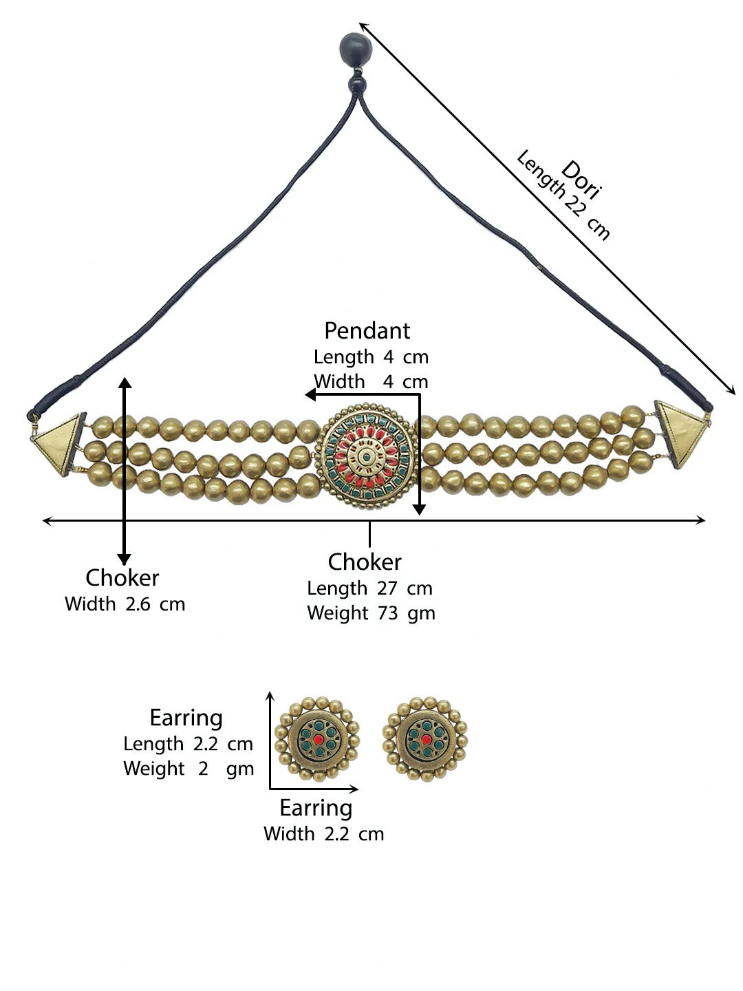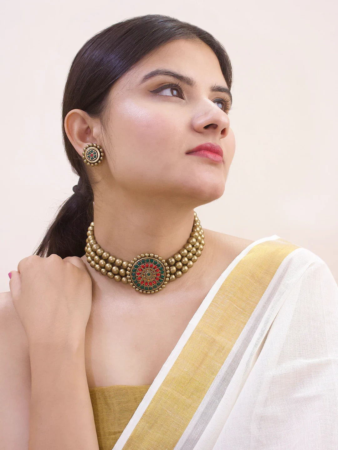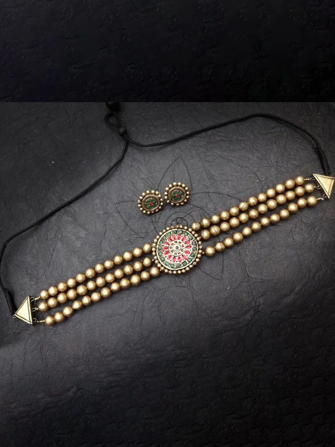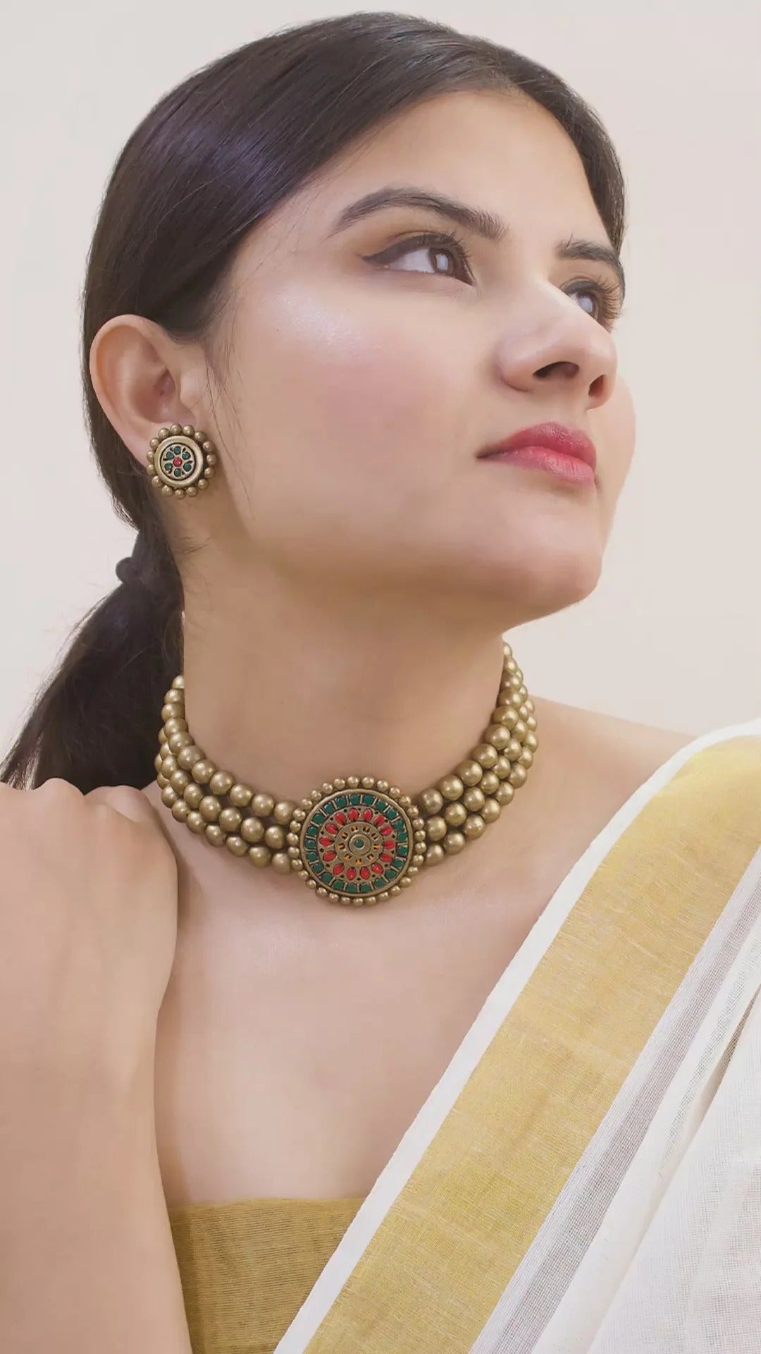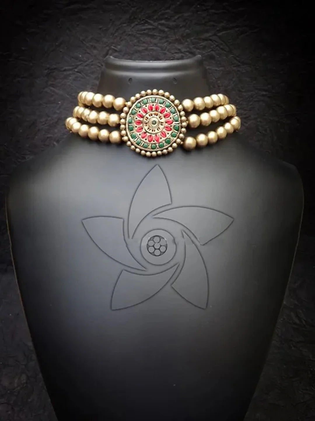Triloka Pushpa — Designer Handmade Three Layered Circular Shape Floral Design Pendant Antique Gold Color Choker Handmade Terracotta Necklace Set