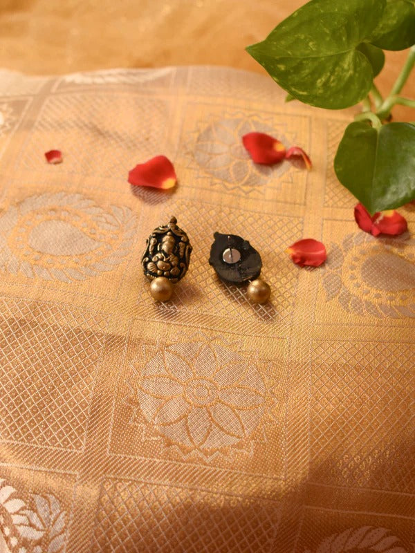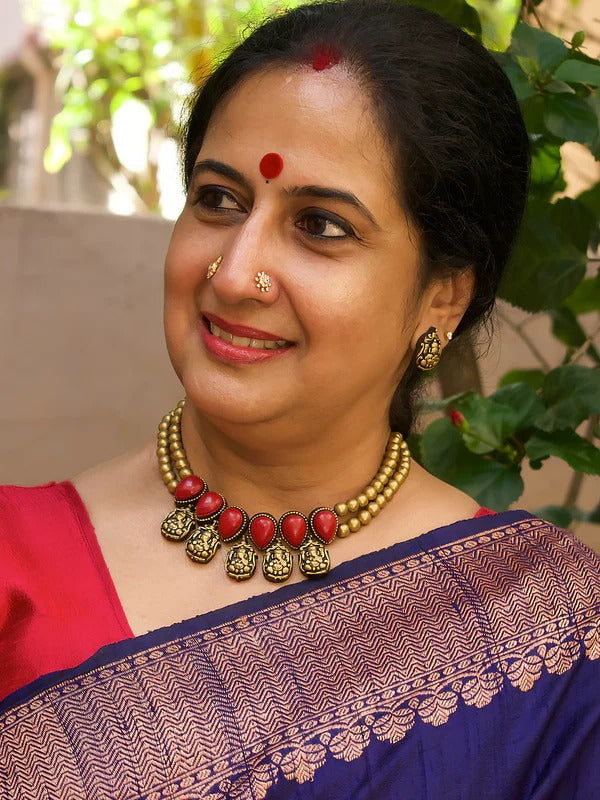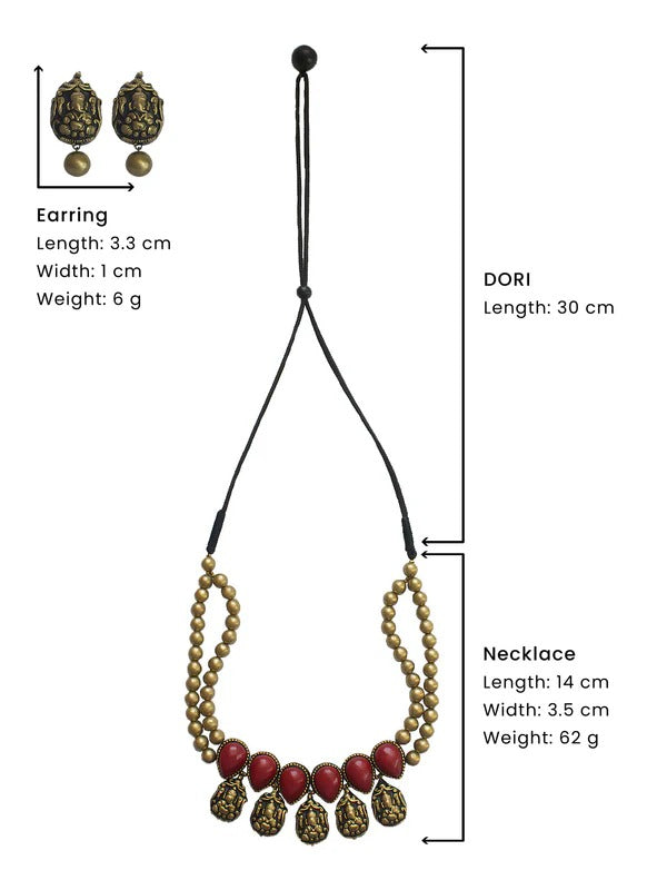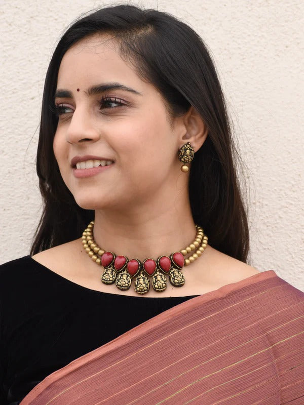 Vighnarudra — Maroon Antique Gold Ganesha Design Two Layered Minimalistic Temple Handmade Terracotta Necklace Set