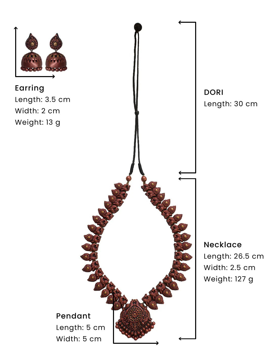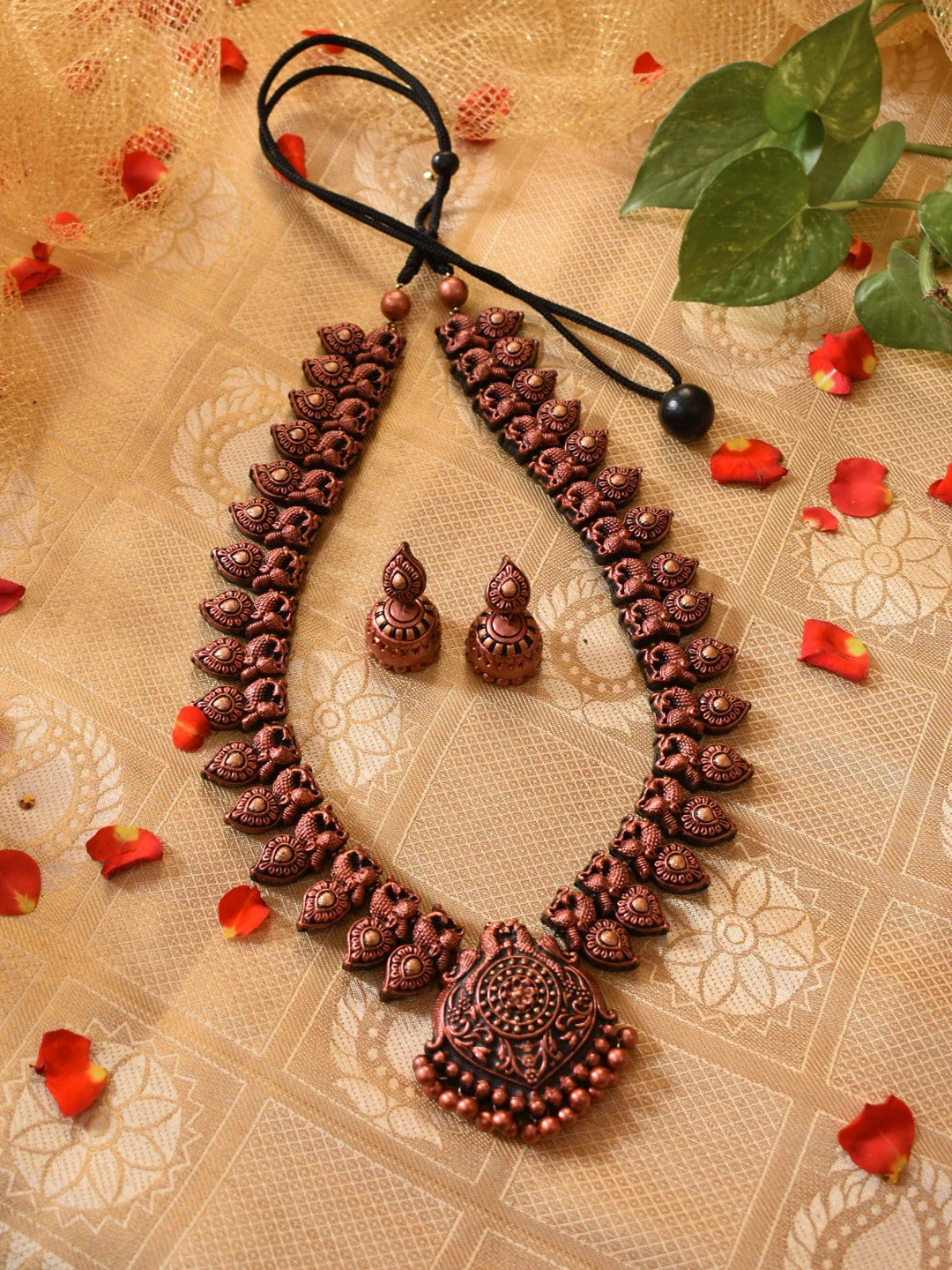 Tamramayura — Copper Finish Grand Peacock Design Haram Handmade Terracotta Necklace Set
